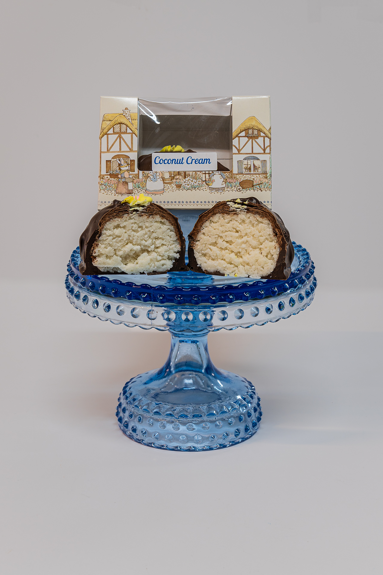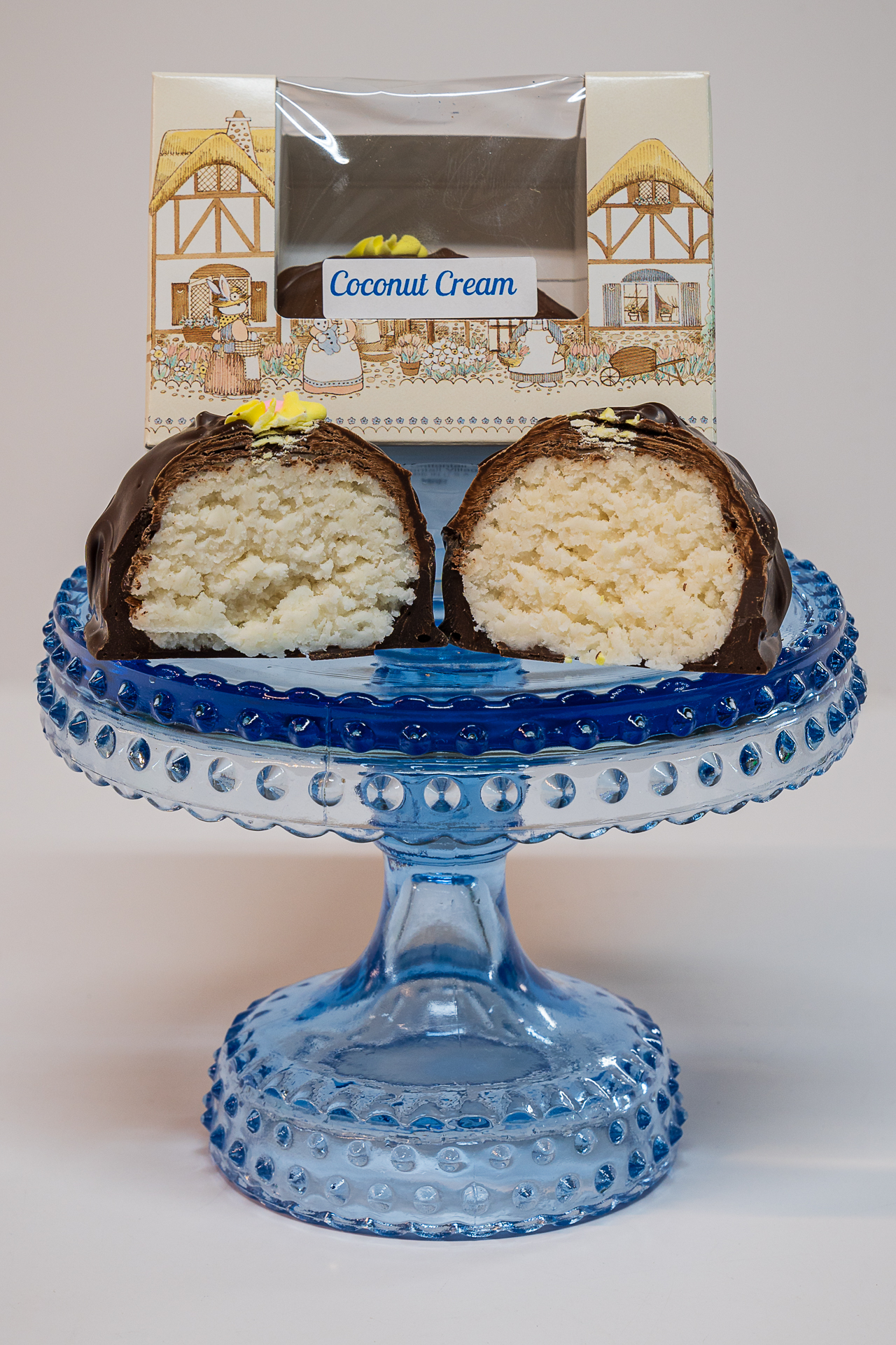 Handmade delicious 8 oz Coconut cream eggs are available in both Milk and Dark Chocolate.